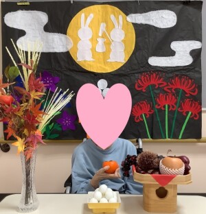 今日は”十五夜”ですね~。いつも9月のイメージがありますが、その年年によって違うようですね。今年も秋の実りに感謝を捧げ、記念撮影を行いました♪お供え物の団子や果実のレプリカ飾りを見て、”おいしそうだね””本物みたい”との声が聞かれました。まだ日中は暑さを感じる日もありますので、皆様、くれぐれも体調管理にはお気を付け下さいね。